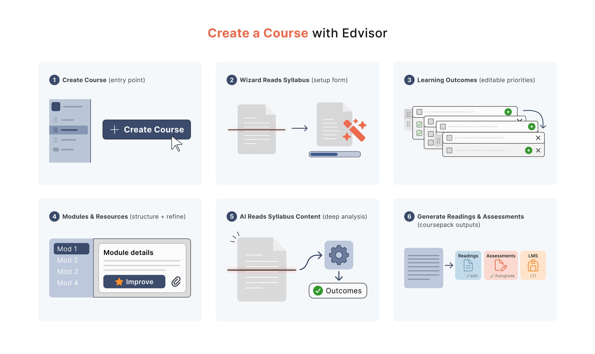 Edvisor’s syllabus generator does exactly that. Its pedagogical structure with a curriculum-trained AI allows professors to move from a blank page to a customizable syllabus in minutes. From there, it can even build full AI-powered coursepacks aligned with outcomes and assessments.